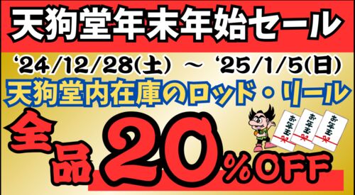 こんにちは!西尾店竹下です! いよいよ明日12/28より! 2024-2025 天狗堂 年末年始セールの目玉企画! 天狗堂内在庫のロッド・リール全品平常価格より20%OFFキャンペーンが始まります! 天狗堂在庫の商品であれば… 電動リールも、2024年発売の商品も人気ロ…