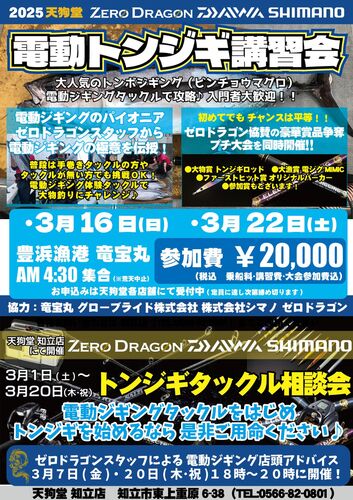 未経験者大歓迎♬ 「2025天狗堂 電動トンジギ講習会」開催!! 2月9日(日)まで未経験者 先行申込開始!! ここ数年で一気にメジャーな釣りのジャンルとなってきた『トンジギ』。 トンボマグロ=ビンチョウマグロをジギングで釣る、 近海で手軽にチャレンジできる…
